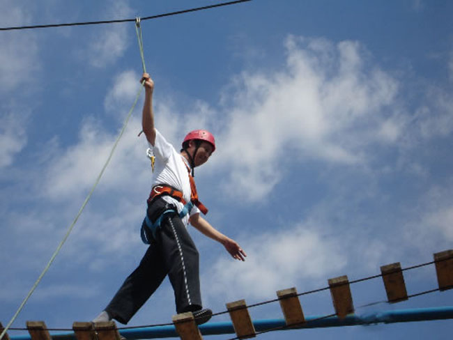 2、學(xué)員身穿安全帶,頭戴頭盔,獨(dú)自爬上八米左右的緬甸橋,沿著橋上的竹竿向?qū)Π蹲撸谶@個(gè)過(guò)程中,不斷越過(guò)沒有竹竿的空白區(qū)域,同時(shí)要盡量保持身體平衡,如果是比賽,兩隊(duì)可以在規(guī)定時(shí)間內(nèi)通過(guò)的人數(shù)為衡量標(biāo)準(zhǔn)。
