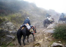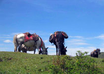 松潘馬隊(duì)有不少,推薦老牌的順江馬隊(duì)(距離汽車站5分鐘步行路程,位置詳見松潘縣示意圖)和新開的騎騎樂馬隊(duì)。順江馬隊(duì)收費(fèi)標(biāo)準(zhǔn)是第一天150元,第二天開始都是每天100元;騎騎樂是無論多少天都是每天100元。