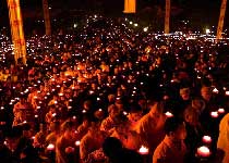 主要活動:“萬盞明燈朝普賢”是規(guī)模宏大的佛教盛事,在峨眉山失傳近千年后,于2002 年底被挖掘和恢復(fù)。禮請德高望重老法師主壇,唱爐香贊、大悲咒、十小咒、心經(jīng)、普賢行愿品、起佛偈、燃燈、繞佛、回向等。舉行盛會的同時,根據(jù)信眾要求,還可舉行普佛、焰口、供天、打七以及大型水陸法會。