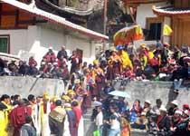 人們穿上節(jié)日盛裝,群聚在為佛教大師而誦祈愿經(jīng)的寺院前,高誦“六字真經(jīng)”,向怫的神靈祈愿、磕頭,各村寨的男人們騎上馬,帶上早已備好的柏香樹枝,到村旁的神塔前,高誦禱詞,舉行盛大的煨桑儀式,并向天空拋撒印有獅、虎、龍、鵬的“龍達”(風(fēng)馬)。男女青年跳起鍋莊舞,老人們坐在看臺上邊喝酒、聊天。還有能說善唱的藝人說唱藏族民間長詩、格薩爾王傳等,直至圓月升起,人們才扶老攜幼,高唱誦念“六字真經(jīng)”愉快地回家。
