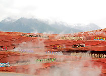 雪山篇將劇場(chǎng)設(shè)在海拔3100米玉龍雪山的懷抱里,四周高山草甸、白云繚繞,劇場(chǎng)為360度全視角,用象征著云貴高原紅土的紅色沙石砌成了12米高、迂回艱險(xiǎn)的“茶馬古道”。五百多個(gè)演員都是當(dāng)?shù)厝?,表演出了散居麗江的十個(gè)少數(shù)民族的生活。