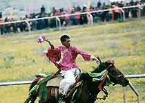 香格里拉賽馬節(jié)由來已久,是香格里拉縣各族群眾最為隆重的傳統(tǒng)民俗節(jié)日,也是藏民們在春天里的一次盛大集會(huì)。現(xiàn)在的賽馬節(jié)已發(fā)展為民族運(yùn)動(dòng)競賽和民間文藝活動(dòng)的交流盛會(huì)。賽馬節(jié)的舉辦時(shí)間一般在農(nóng)歷端午節(jié)前后,通常持續(xù)3天。地點(diǎn)在舞鳳山賽馬場。
