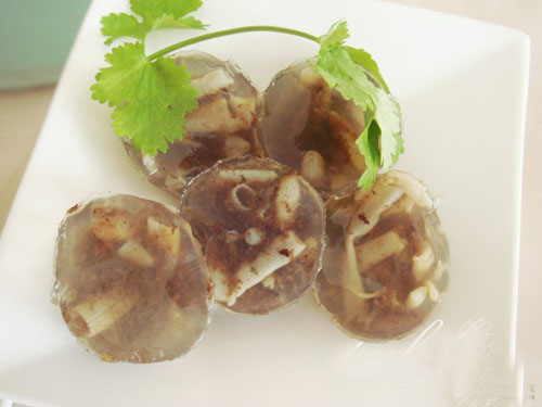 特產(chǎn)土筍凍,特色食品,是一種由特有產(chǎn)品加工而成的凍品。 它含有膠質(zhì),主原料是一種環(huán)節(jié)動物,學(xué)名海星蟲,身長二、三寸,經(jīng)過熬煮,所含膠質(zhì)溶入水中,冷卻后即凝結(jié)成,其肉清,味美甘鮮。配上好醬油、北醋、甜醬、辣醬、芥辣、蒜蓉、海蜇及芫荽、白蘿卜絲、辣椒絲、番茄片,就成了色香味俱佳的風(fēng)味小吃。亮晶晶,吃起來很清爽很香嫩,常常用芥末來做調(diào)料。土筍凍特別是在加上點鎮(zhèn)江陳醋哇那味道真的是美極了。