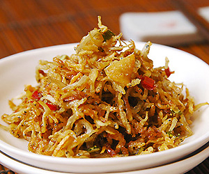 惠安人還愛吃小章魚,好的小章魚個(gè)小、腳短、一口一個(gè),就是太貴,現(xiàn)在一斤要百來塊,訂貨還要快,晚了就沒有了。買不到小章魚,不要急,我們來個(gè)漁家樂好了,如果到了惠安東部近海端的小乍鎮(zhèn),隨便進(jìn)到一家漁民家里,熱情好客的漁家人都會(huì)熱情的挽留,備酒,沒有什么山珍海味,就本地捕的小魷魚干,放在煤炭爐蓋上烤,不一會(huì)兒,一股濃香彌漫滿屋(聞不慣魚腥味的就別在屋里待著了),一碟香噴噴的焦黃小魷魚干上桌,酒不醉人人自醉,吃過的人都大呼“三日不知肉香”。