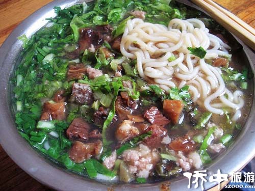 (2)吃米粉時,隨吃隨榨。將弄好的粉團放在一個穿有幾十個小孔的圓鐵罐中,用一個削成圓形剛好能放進鐵罐的木頭,使勁壓塞進罐中的粉團,使粉團從小孔被擠出一條條圓形的米粉線,下面放一口燒著滾開水的大鍋,從小孔出來的細粉條直接掉入開水里,不一會就熟了,撈上來盛入碗內(nèi)就成為生榨米粉了。
