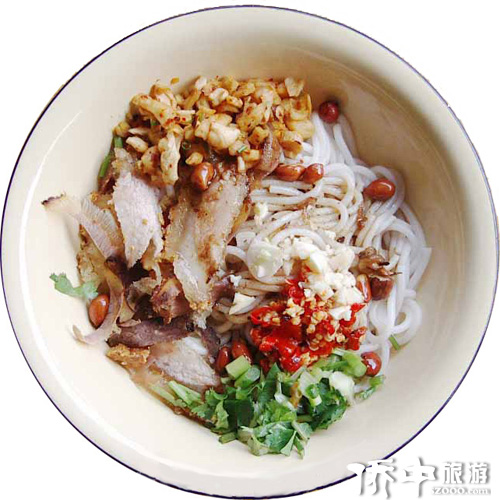 主料:米粉。輔料:鹵肉、熟豬肝、鹵肉水。調(diào)料:蔥花、花生米、醬油。