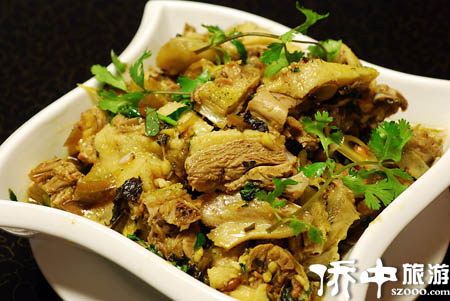 檸檬鴨是南寧人有口皆碑的一道名菜。檸檬鴨做法較為講究,首先鴨子的選擇最好是1.5公斤左右的正宗谷糠喂大的土鴨或北京鴨。檸檬鴨味道的好壞重在配料與火候掌握。配料需陳年腌制的檸檬,另外還要酸蕎頭、酸辣椒、酸梅、豆腐乳、白糖、黃酒和鮮姜等,這些配料與鴨塊一起爆炒幾下,再細(xì)燜至鴨肉熟透,即可享用,其味酸辣適宜,鮮香可口,是一道極其開胃的菜哦。
