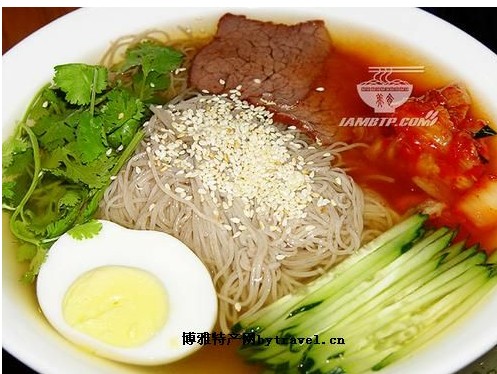 另外,從材料上看,平壤冷面是主要用蕎麥面或小麥面加土豆淀粉加水拌勻,壓成圓面條。平壤冷面由于蕎麥的含量高所以比咸興冷面面條粗更有彈性。平壤冷面的做法是,將壓成的圓面條煮熟后浸以冷水,再去冷水伴牛肉片、辣椒、雞蛋、泡菜、梨或蘋果片、醬醋、香油等佐料,加入燉牛骨湯或淹蘿卜泡菜湯等即成??诟猩现v究酸酸甜甜,清涼爽口,滑順潤喉。