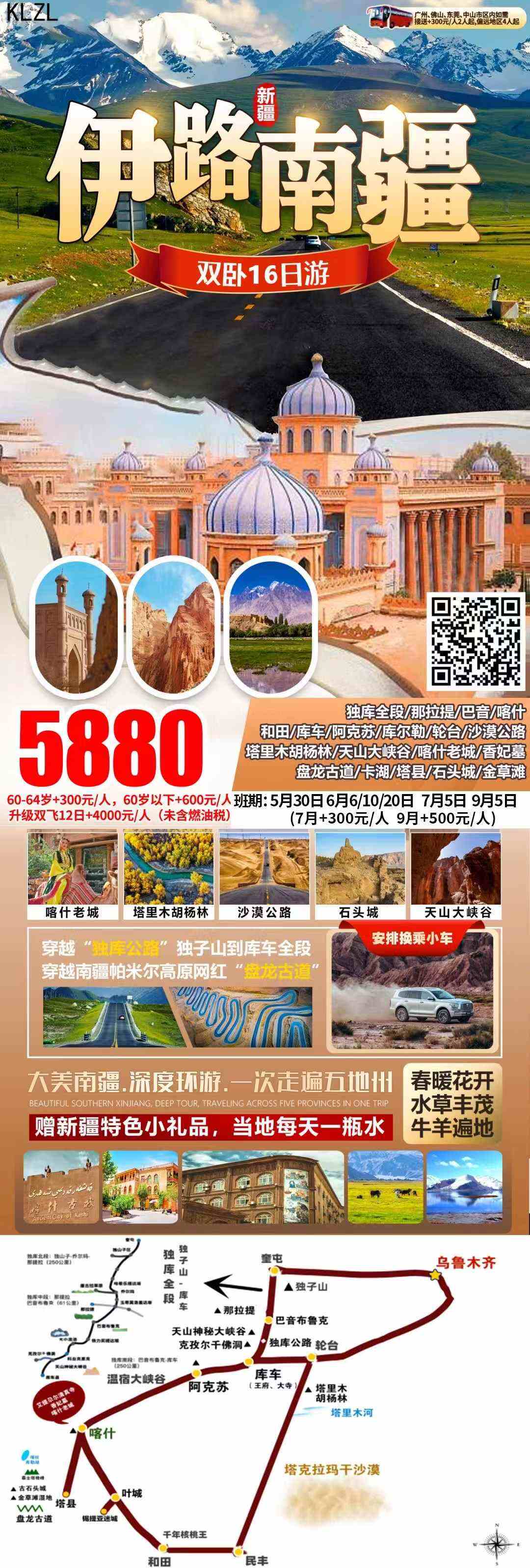 獨庫全段.那拉提.巴音.喀什.和田.庫車.阿克蘇.庫爾勒.輪臺.沙漠公路.塔里木胡楊林.天山大峽谷.喀什老城.香妃墓.盤龍古道.卡湖.塔縣.石頭城.金草灘