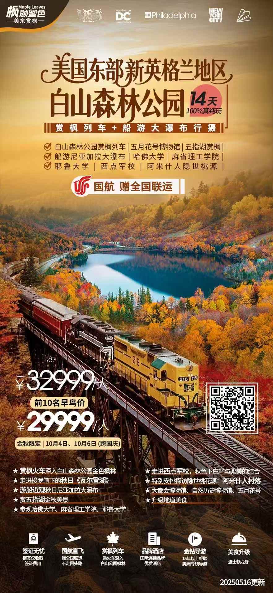 10月國(guó)航·全國(guó)聯(lián)運(yùn)最佳賞楓季美國(guó)東部 | 行攝純玩14天·新英格蘭地區(qū)+白山森林公園+賞楓列車+船游大瀑布