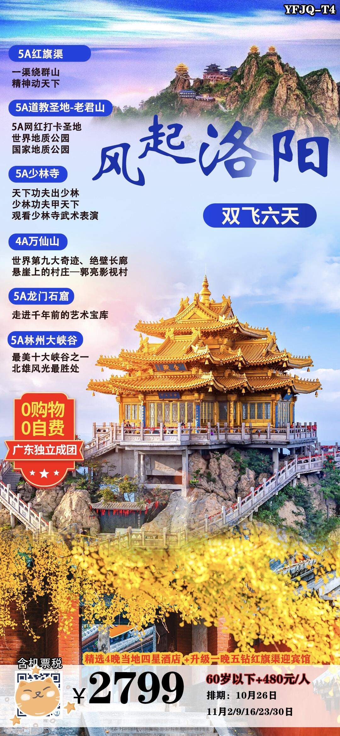 ¥2799 排期:10月26日 11月2/9/16/23/30日 60歲以下+480元/人