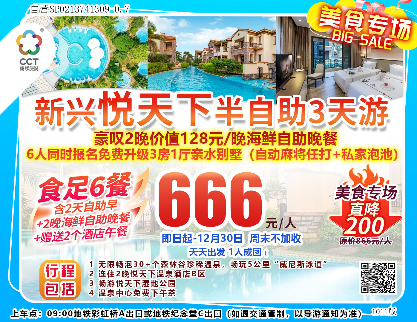【新興.直通車】 美食專場 廣州往返新興悅天下溫泉酒店半自助3天游