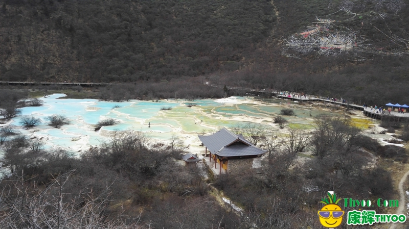 第二天前往黃龍-在黃龍先纜車到山頂,在徒步下來,看了雪山,五彩池,晚上到達九寨,入住九寨洲際天堂酒店。