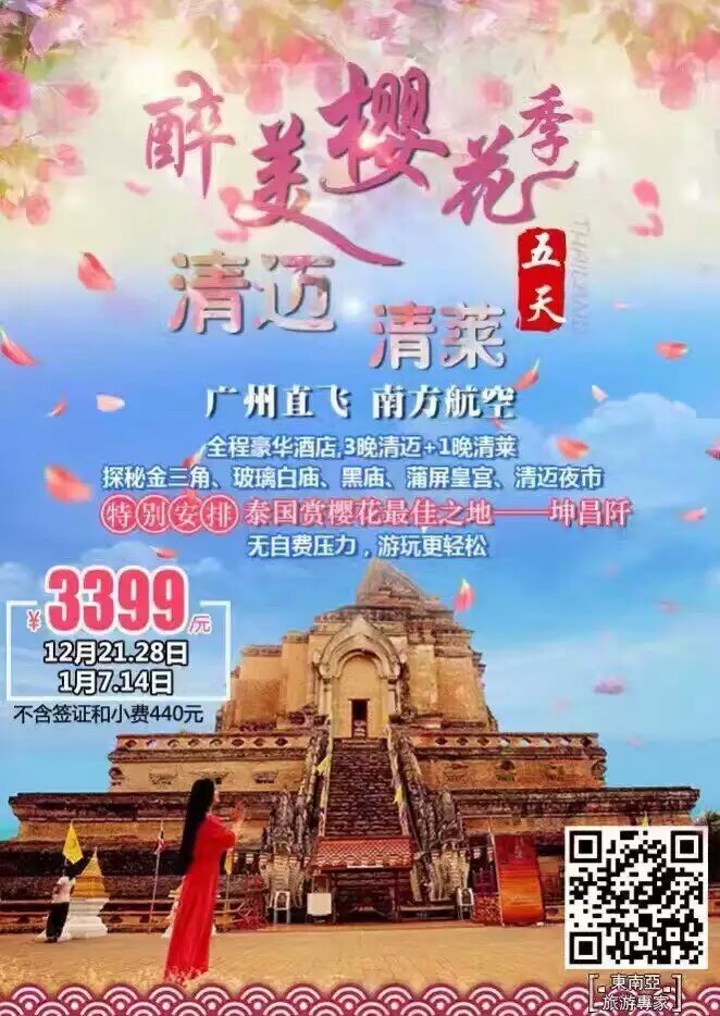 <錯峰游>廣州往返直飛泰國清邁 清萊4晚5日跟團游,泰北雙城,醉美櫻花谷,游白廟+黑廟★ 行:廣州南航直飛,免卻轉機的勞累