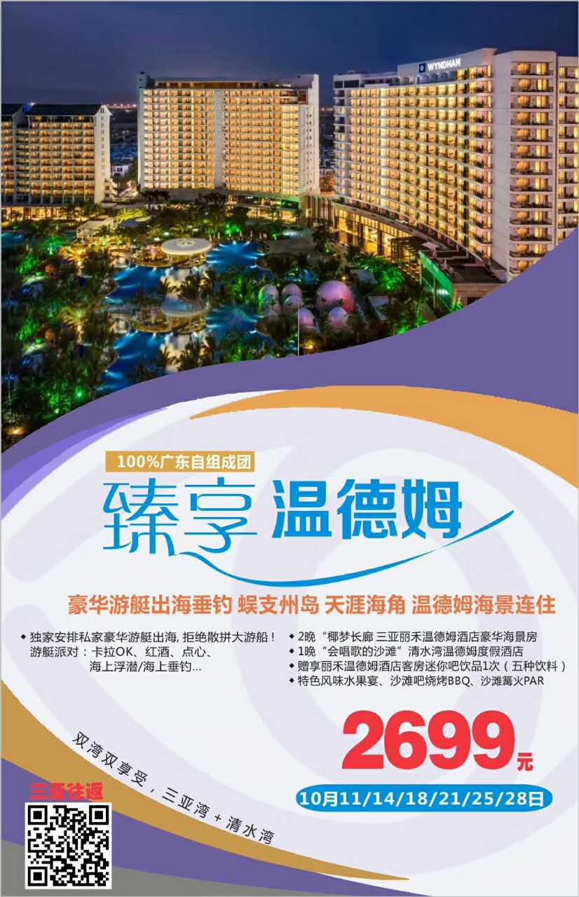 雙灣五星雙享受:2晚三亞灣溫德姆海景房+1晚清水灣溫德姆豪華房