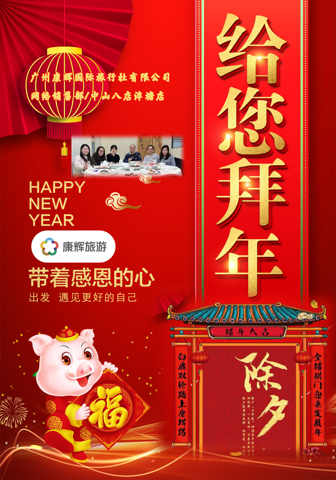 今天是年三十,廣州康輝國際旅行社網(wǎng)絡(luò)銷售部/中山八泮塘店恭祝您新年快樂,萬事如意,身體健康,豬年大吉。
