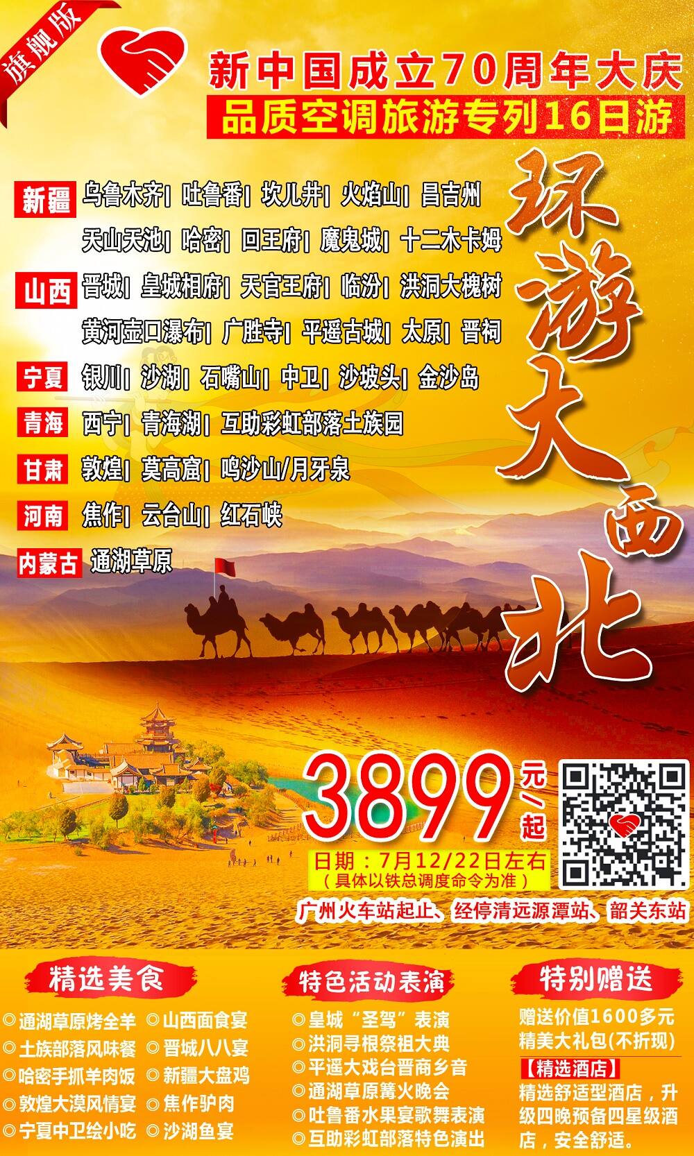 新疆(烏魯木齊、吐魯番、坎兒井、火焰山、昌吉州、天山天池、哈密、回王府、魔鬼城、十二木卡姆)青海(西寧、青海湖、互助彩虹部落土族園)甘肅(敦煌、莫高窟、鳴沙山/月牙泉)寧夏(銀川、沙湖、中衛(wèi)、沙坡頭、金沙島)內(nèi)蒙古(通湖草原)山西(晉城、皇城相府、天官王府、臨汾、洪洞大槐樹、黃河壺口瀑布、廣勝寺、平遙古城、太原、晉祠)河南(焦作、云臺山)品質(zhì)空調(diào)旅游專列16日游