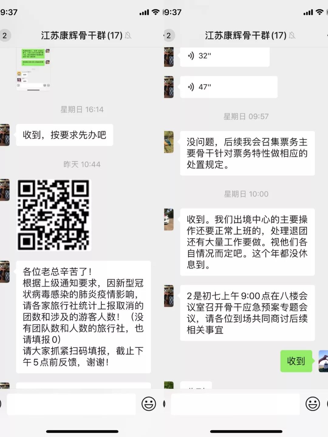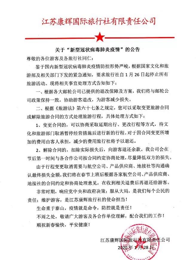 江蘇康輝大年夜組成17人應(yīng)急小組,張新忠總經(jīng)理緊急部署落實(shí),啟動應(yīng)急預(yù)案,全體干部員工節(jié)假日期間,相關(guān)部門全員加班,對已出游客戶跟蹤追訪,對27號以后無法出游的出境游客進(jìn)行解釋,辦理各種退改簽的手續(xù),操作部門跟航空公司、境外接待旅行社進(jìn)行多方交涉,努力勸解每一位游客,尤其是不理解、不配合的游客返程,堅(jiān)決執(zhí)行國家應(yīng)對疫情變化不斷出臺的緊急通知,堅(jiān)定不移保障游客的生命安全,絕不會絲毫懈怠!