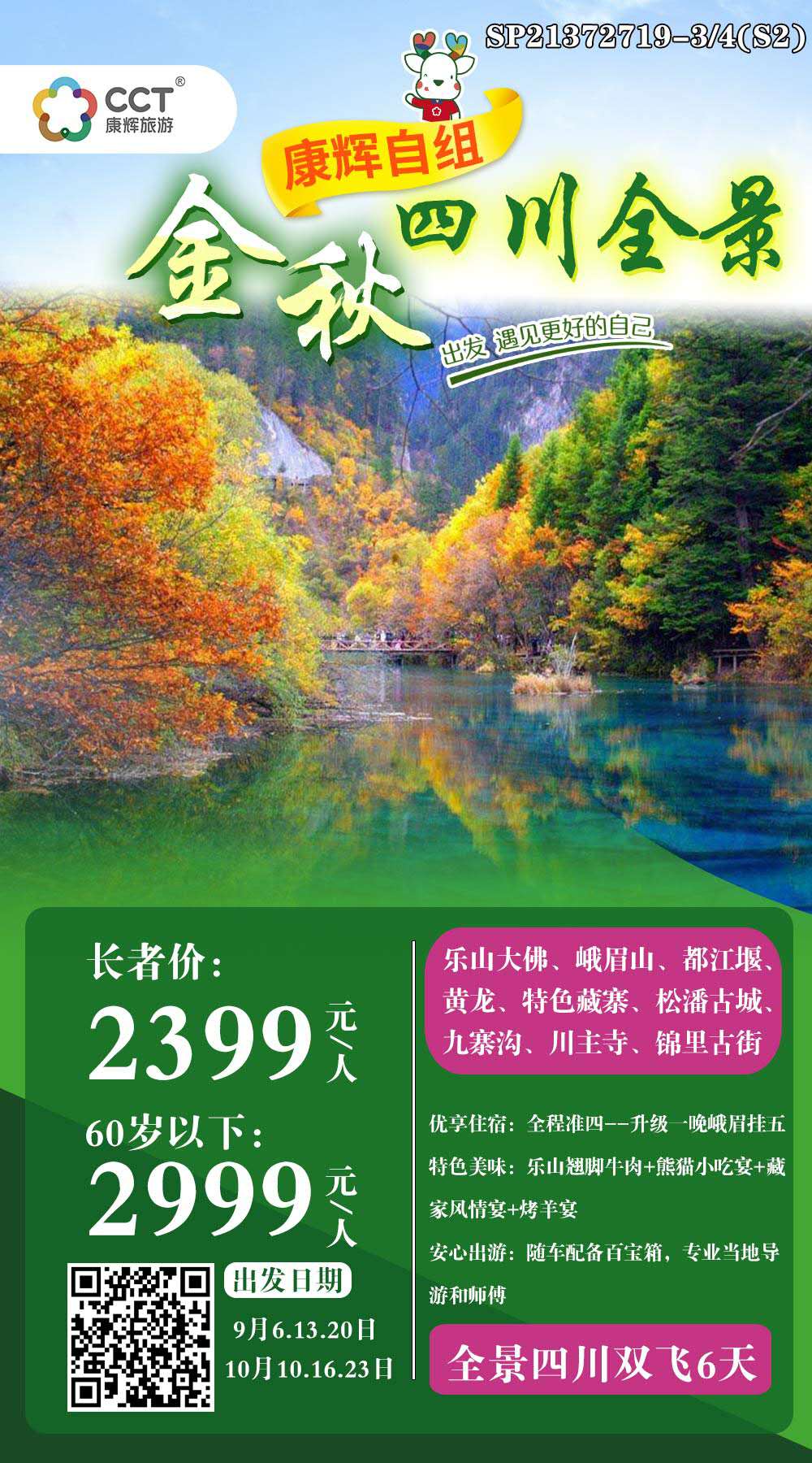 【金秋四川全景】 廣州往返四川成都、樂山大佛、峨眉山、都江堰、九寨溝、黃龍、錦里古街雙飛6天