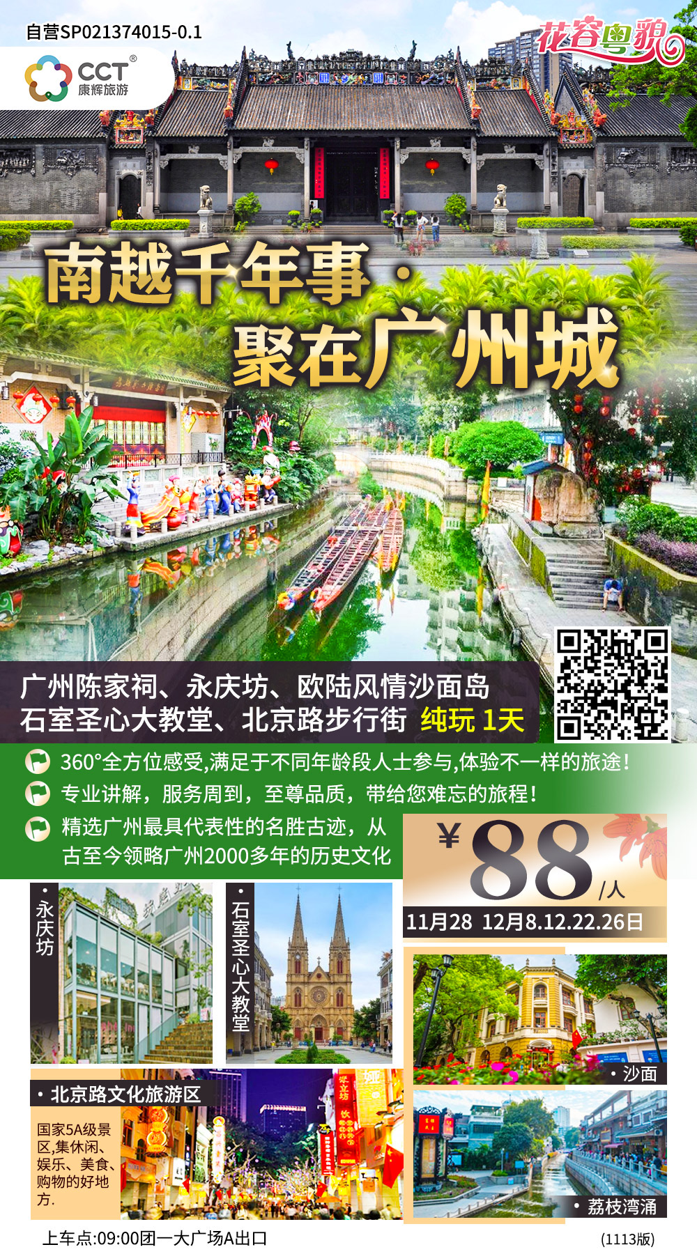 09:00團(tuán)一大廣場(chǎng)地鐵A出口集合,乘車前往參觀“嶺南建筑藝術(shù)明珠”--陳家祠,游覽完畢后前往西關(guān)老城區(qū),先游覽改造后的西關(guān)大街—永慶坊,再參觀荔灣博物館感受獨(dú)特的西關(guān)文化習(xí)俗,中午可在荔枝灣涌附近尋找當(dāng)?shù)孛朗?。下午前往?50多座歐洲風(fēng)格建筑的沙面島,是廣州具異國(guó)情調(diào)的歐洲建筑群體。后游覽可與法國(guó)巴黎圣母院相媲美的石室圣心大教堂,隨后于約定時(shí)間集合前往北京路商業(yè)步行街自由活動(dòng),結(jié)束愉快的行程!