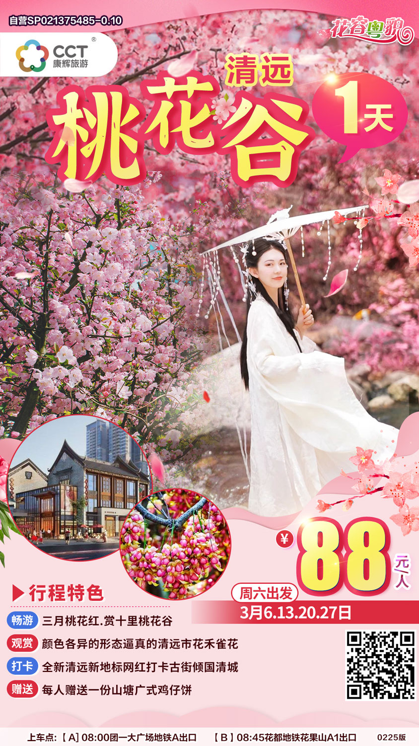 【女神節(jié)賞花季】廣州往返清遠(yuǎn)桃花谷、禾雀花基地、傾國清城純玩一天跟團游