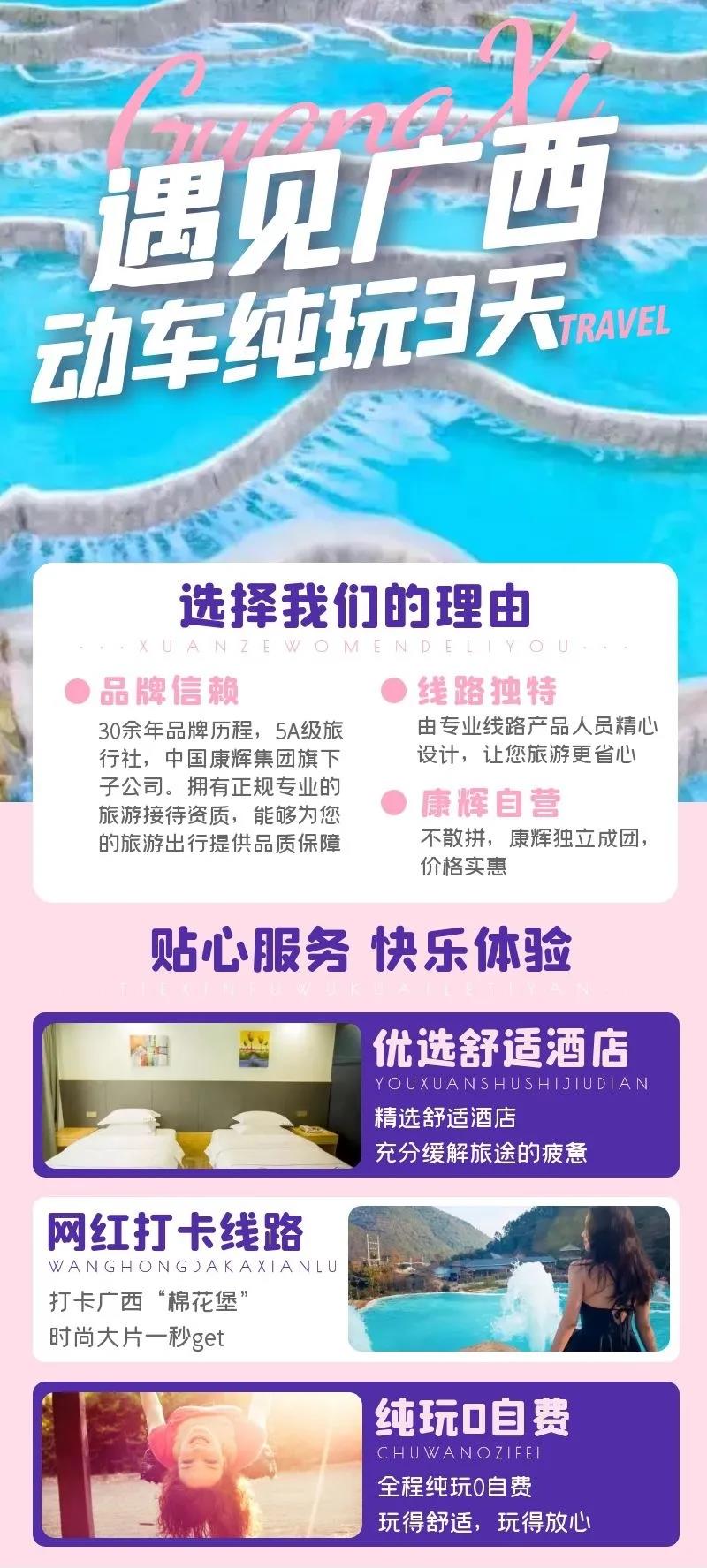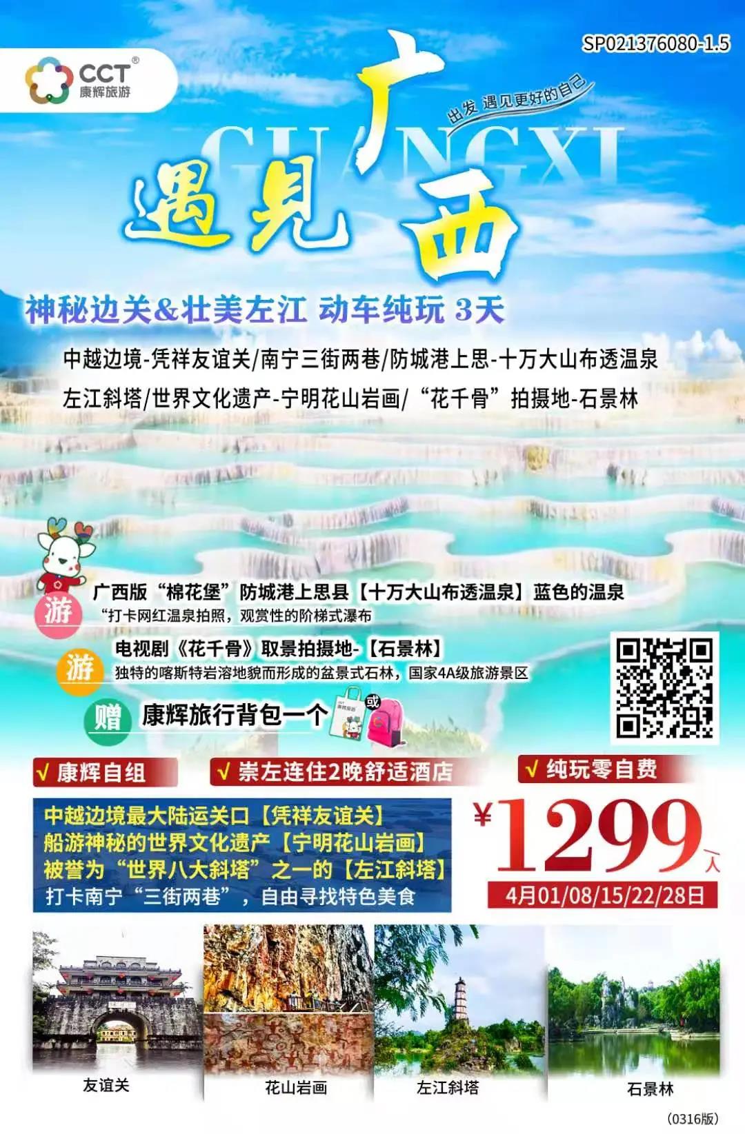 廣州南站乘動車前往南寧東(動車二等座,車程時間約3.5小時,實際以出票為準(zhǔn),午餐動車上自理)。導(dǎo)游接團后乘車前往防城港上思縣【十萬大山布透溫泉】(約106公里,車程約2.5小時)景區(qū)三面環(huán)山,地處幽谷,風(fēng)景優(yōu)美。泉水從溝邊巖穴中涌出,水溫37-38度。古時為縣的八景之一,名為“溫泉晚眺”。溫泉1988年1月經(jīng)國家評審鑒定,確認(rèn)為鍶和偏硅酸的含量接近國家標(biāo)準(zhǔn),鈉含量低且游離二氧化碳含量較高;同時溫度和氨的指標(biāo)均達到醫(yī)療礦泉水標(biāo)準(zhǔn)。抵達溫泉后自由活動,打卡網(wǎng)紅溫泉拍照,這里還有觀賞性的階梯式瀑布;適當(dāng)休息后再爽泡溫泉。在景區(qū)用晚餐,晚餐后約19:00出發(fā)前往崇左(車程約100公里)入住酒店休息。