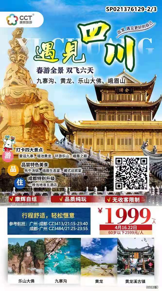 廣州往返成都、九寨溝、黃龍、峨眉山、樂山純玩雙飛6天5晚跟團游