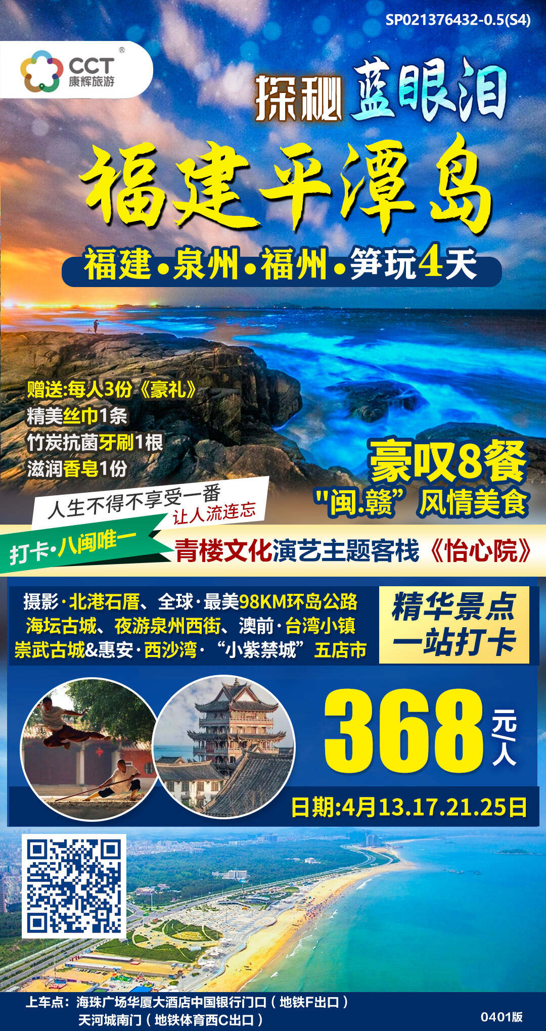 早餐后,前往參觀參觀晉江標桿企業(yè)【閩南·燕窩基地】(本項目屬于企業(yè)參觀“透明”制作過程,不屬于購物范圍內(nèi),請游客悉知!)福建品鑒食品有限公司是一家滋養(yǎng)品研發(fā)、生產(chǎn)、銷售的企業(yè),總部位于福建晉江。福建品鑒食品有限公司主要產(chǎn)品有品鑒即食燕窩系列、品鑒干貨禮盒系列和品鑒即食美食系列。福建品鑒食品有限公司是泉州市首家獲得燕窩QS認證的企業(yè)。證明材料來自新浪網(wǎng)。福建品鑒食品有限公司入庫福建省科學技術廳福建省科學技術科技型企業(yè)。后乘車前往離臺灣最近的島嶼—【平潭島】是福建省第一大島,全國第五大島,地處中國東南沿海,東面與臺灣省新竹港相距僅68海里,是中國大陸距臺灣最近處。島上時常“東來嵐氣彌漫”,簡稱“嵐”,別稱“東嵐”,舊稱“海山”。途徑【平潭海峽大橋】為福建省第一座真正意義的跨海特大橋。抵達平潭后前往酒店辦理入住手續(xù)。晚上可自行前往平潭沙灘—龍風頭。游覽有“中國愛情海”之稱的【北港石厝】位于平潭最高峰君山東麓,背山面海。從環(huán)島路上望去,只見村里一大片黛青色的石頭厝整齊地排列在沿岸的山坡之上,碧海藍天之下質樸滄桑的北港石厝群落,猶如宮崎駿畫筆下的童話城堡。沿途可以看到平潭最美環(huán)島路,來一段“千礁百島”縣的探險之旅。后前往以“閩越海洋文化、海上絲綢文化”為根基的中國首座海島古城”--【海壇古城】在明清古建筑群中去體驗地道閩臺美食、暢購臺灣免稅文創(chuàng)精品、品味中華國粹精華。走進八閩唯一青樓文化演藝主題客棧--【怡心院】看花魁選秀“怡紅-漪夢” 傾國傾城,讓人流連忘返!后游覽【澳前臺灣小鎮(zhèn)】以平潭臺灣免稅市場為核心,是兩岸共同家園建設的重要載體。晚餐(自理)后入住酒店。