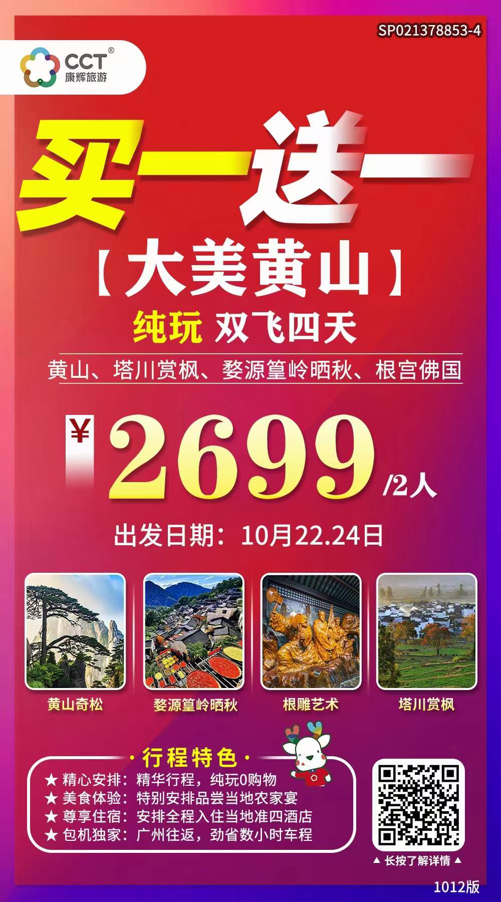 黃山買一送一】廣州雙飛衢州,黃山、塔川賞楓、婺源篁嶺曬秋、根宮佛國四天跟團(tuán)游