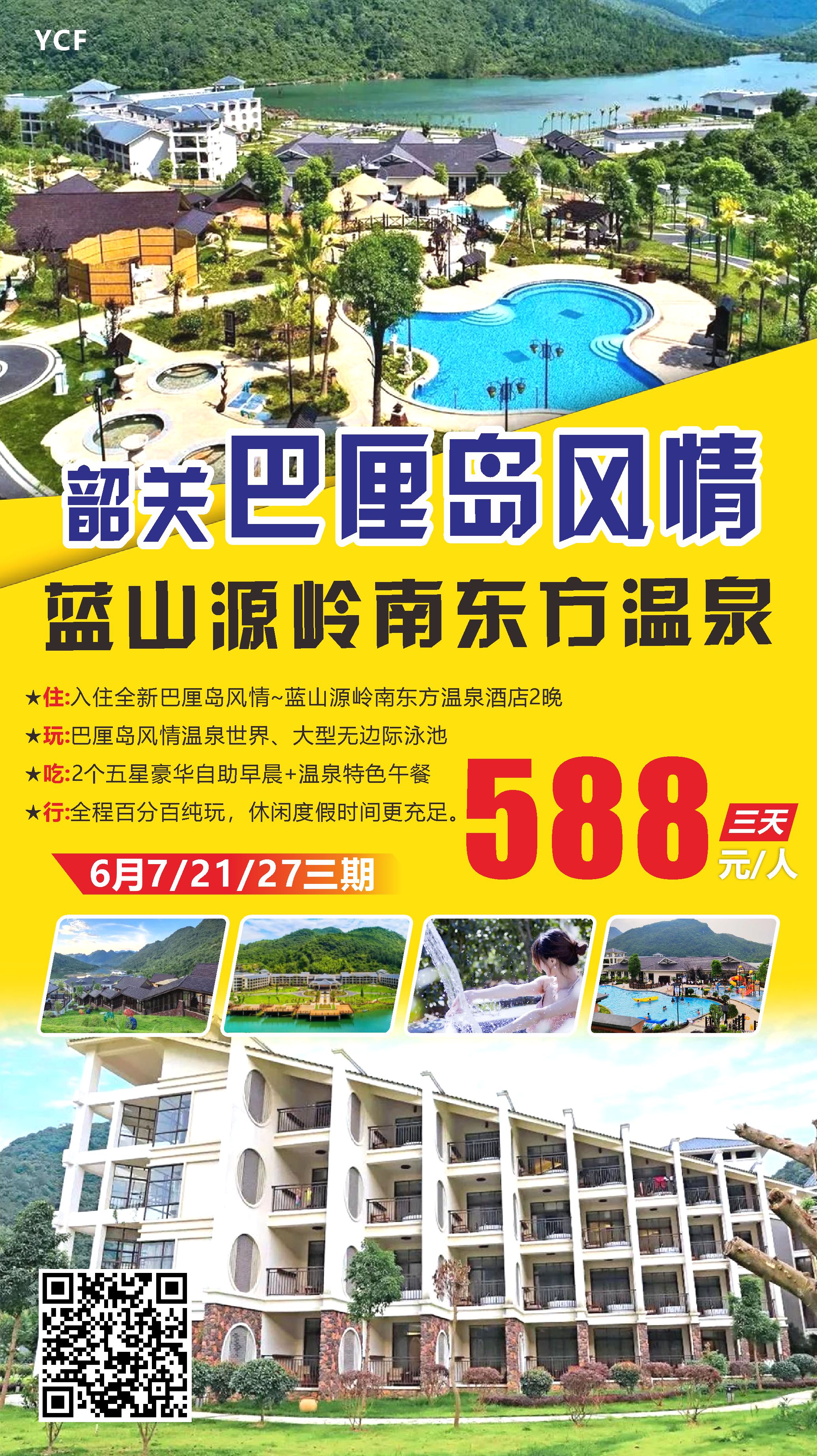 韶關(guān)巴厘島風(fēng)情、藍(lán)山源嶺南東方溫泉三天588元