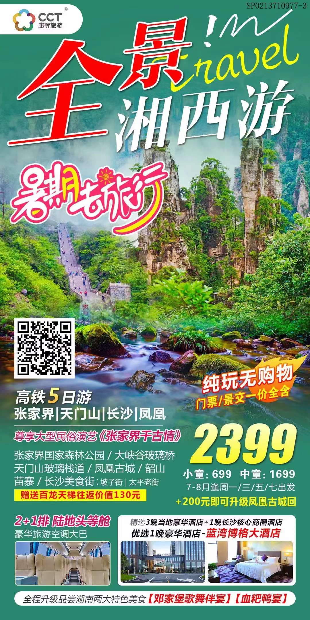 打包贈送項目:張家界千古情(含表演)+百龍?zhí)焯萃?湘西苗寨+天門山扶梯+玻璃棧道鞋套+大峽谷體驗套票+偉人故居韶山環(huán)保車+長沙美食街+鳳凰接駁車
