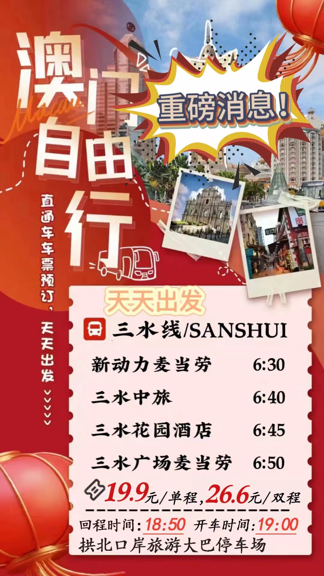 三水廣場(chǎng)麥當(dāng)勞6:5019.9元/單程,26.6元/雙程回程時(shí)間:18:50 開(kāi)車(chē)時(shí)間:19:00拱北口岸旅游大巴停車(chē)場(chǎng)