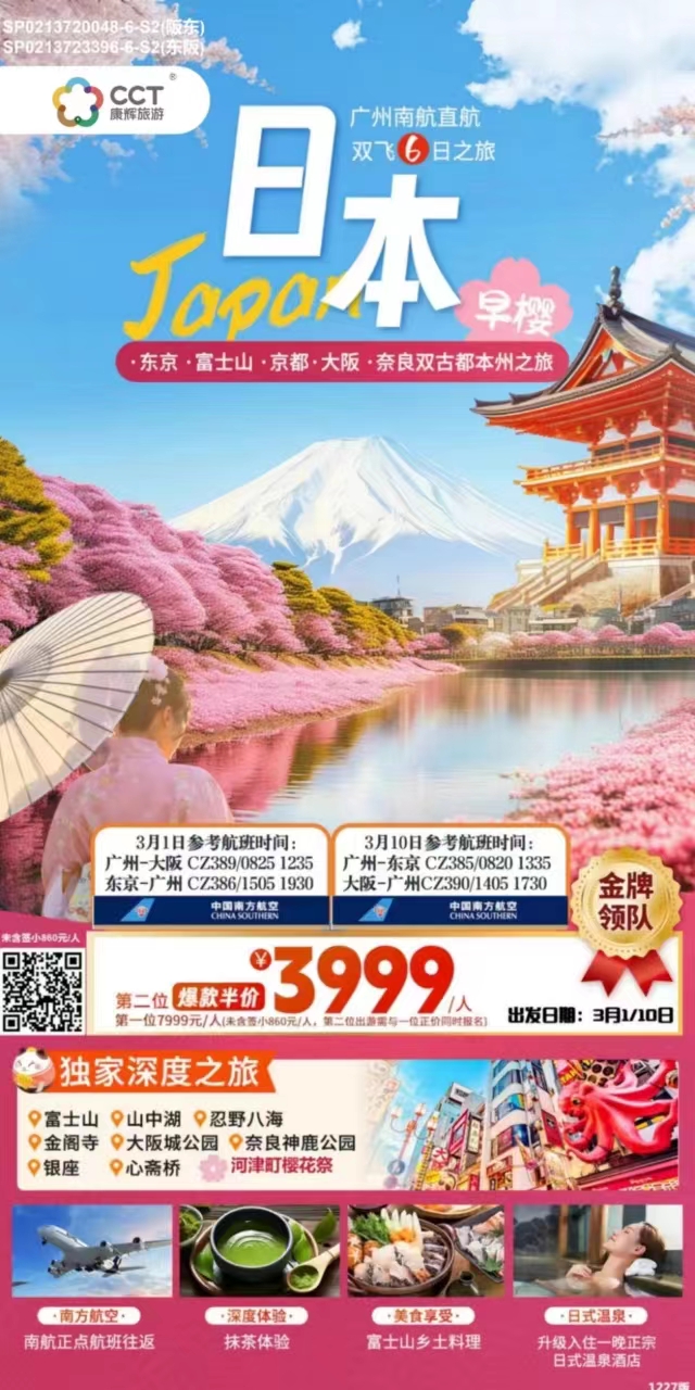 <定制團(tuán)>日本本州雙古都東京往返雙飛6天早櫻(廣州-阪東)