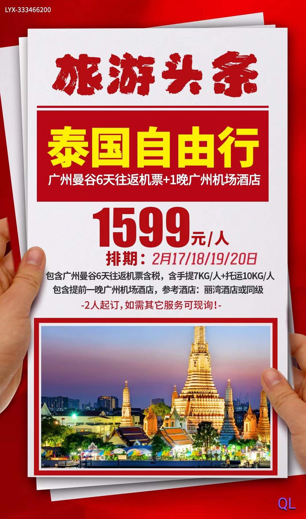 包含廣州曼谷6天往返機票含稅,含手提7KG/人+托運10KG/人包含提前一晚廣州機場酒店,參考酒店:麗灣酒店或同級-2人起訂,如需其它服務(wù)可現(xiàn)詢!