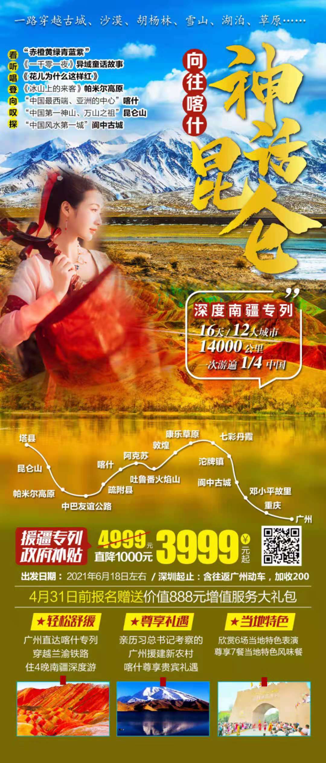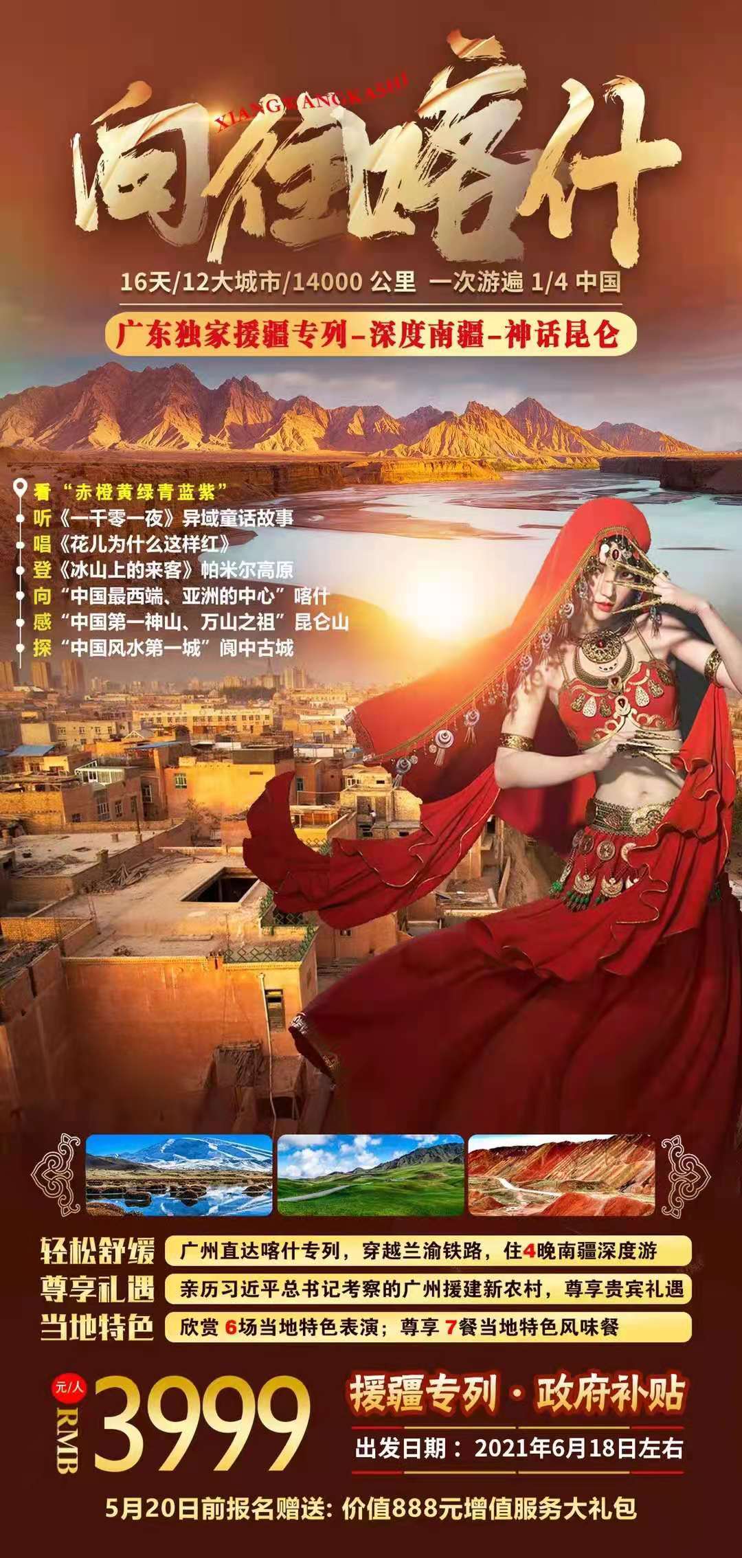 首頁 > 國內(nèi)游 > 特色旅游 > 老人旅游專列 > 6月向往喀什神話昆侖專列16天深度南疆-扶貧援疆專列路穿越古城、沙漠、胡楊林、雪山、湖泊、草原 (注意:線路僅供參考展示 請咨詢客服)