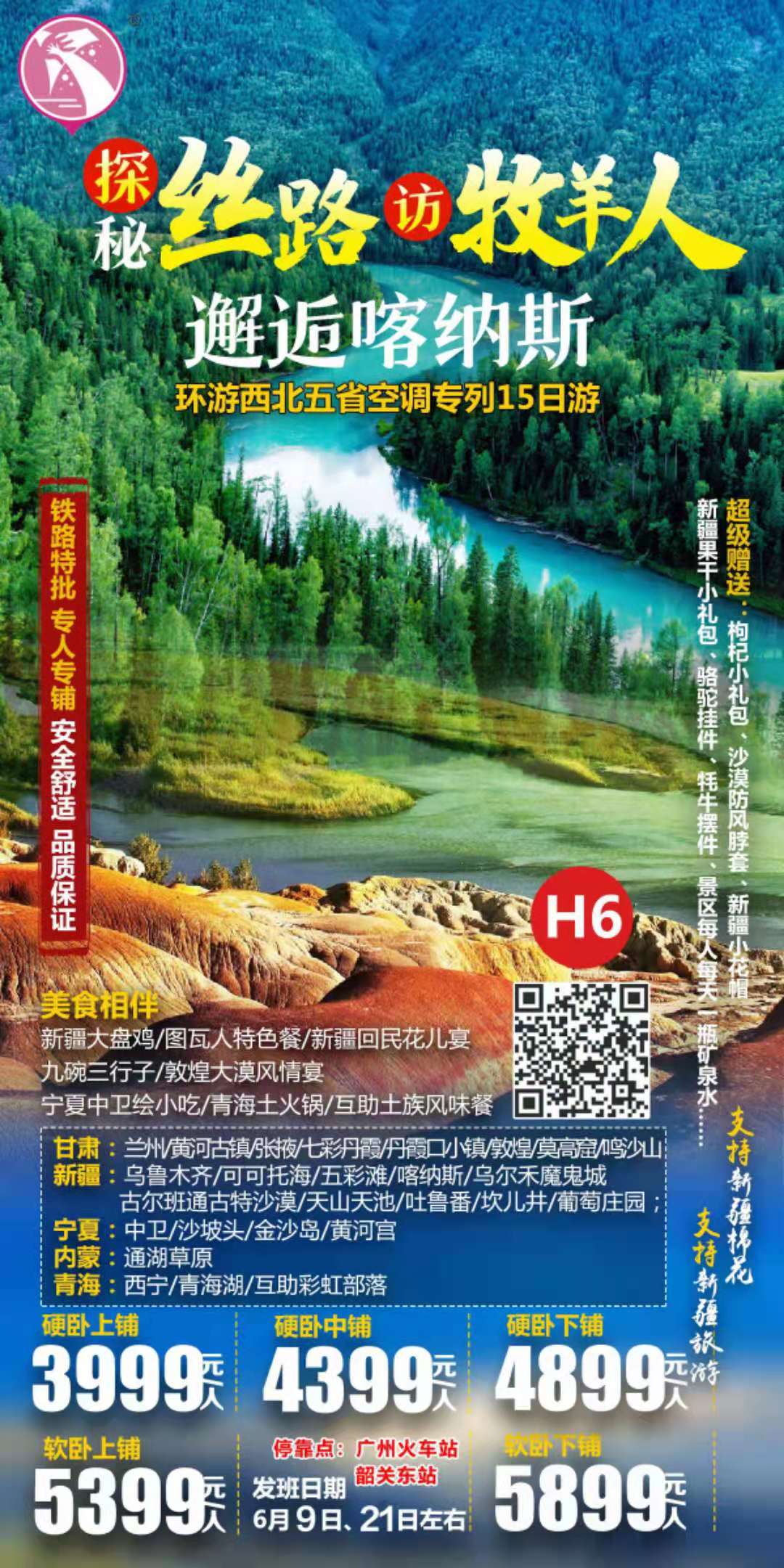 青海,網(wǎng)紅海西、絕美湖景;甘肅,河西雄風(fēng),歷史遺跡;新疆,絢爛文化、西域風(fēng)情;寧夏,沙漠綠洲,塞上江南;內(nèi)蒙,沙草交融,塞北風(fēng)光;神秘、遼闊、奇瑰、壯麗的美景串聯(lián);夕發(fā)朝至,省心省錢(qián),舌尖上的西北,舌尖上的旅行。
