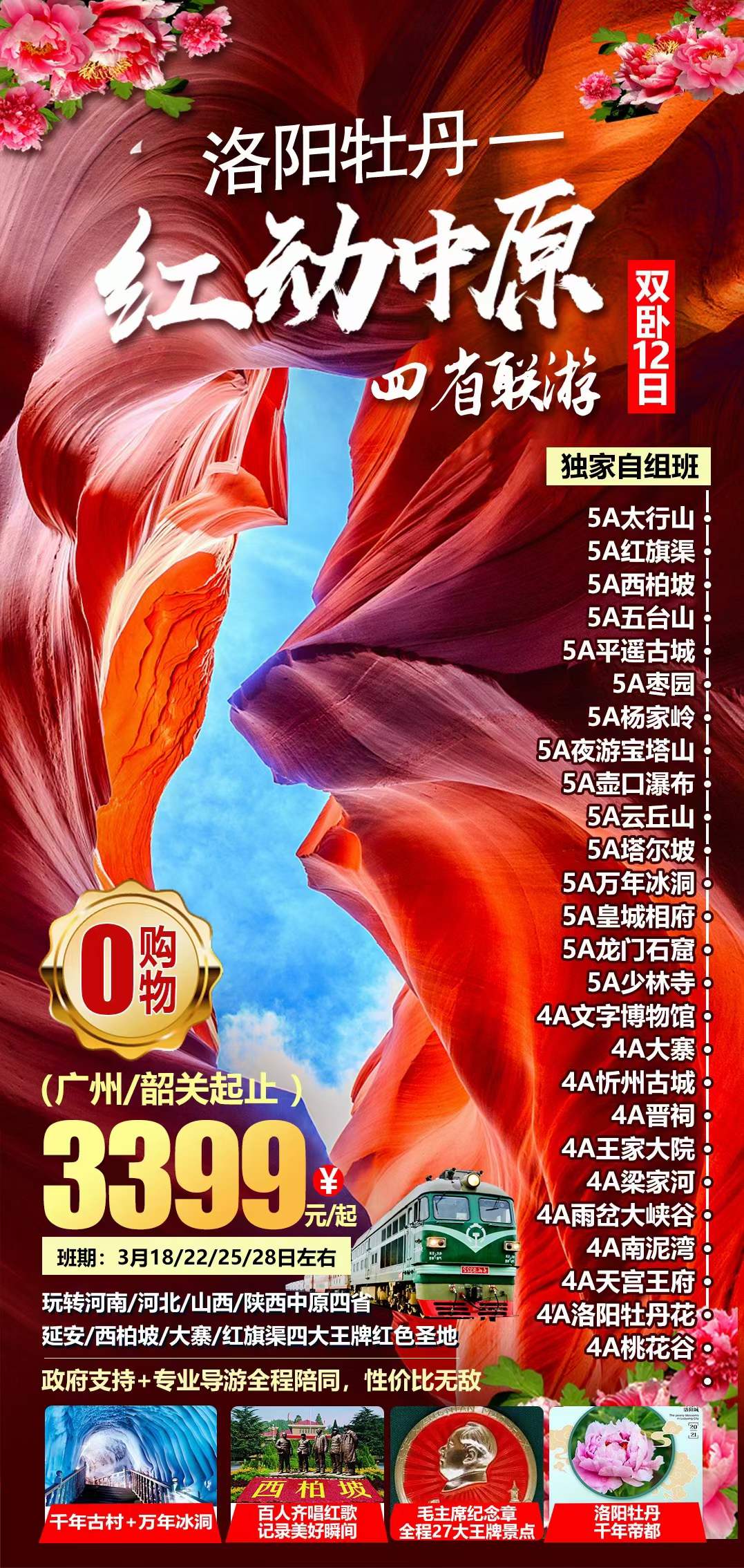 洛陽牡丹、桃花谷、少林寺、龍門石窟、中國文字博物館、太行山大峽谷、紅旗渠、大寨、西柏坡、五臺山、寺廟群、忻州古城、晉祠、平遙古城、王家大院,梁家河,棗園,楊家?guī)X,夜游寶塔山、雨岔大峽谷、南泥灣、壺口瀑布、云丘山、塔爾坡古村、萬年冰洞,深圳,廣州、韶關(guān)東、郴州均可上車!發(fā)班日期:3月18/22/25/28日左右