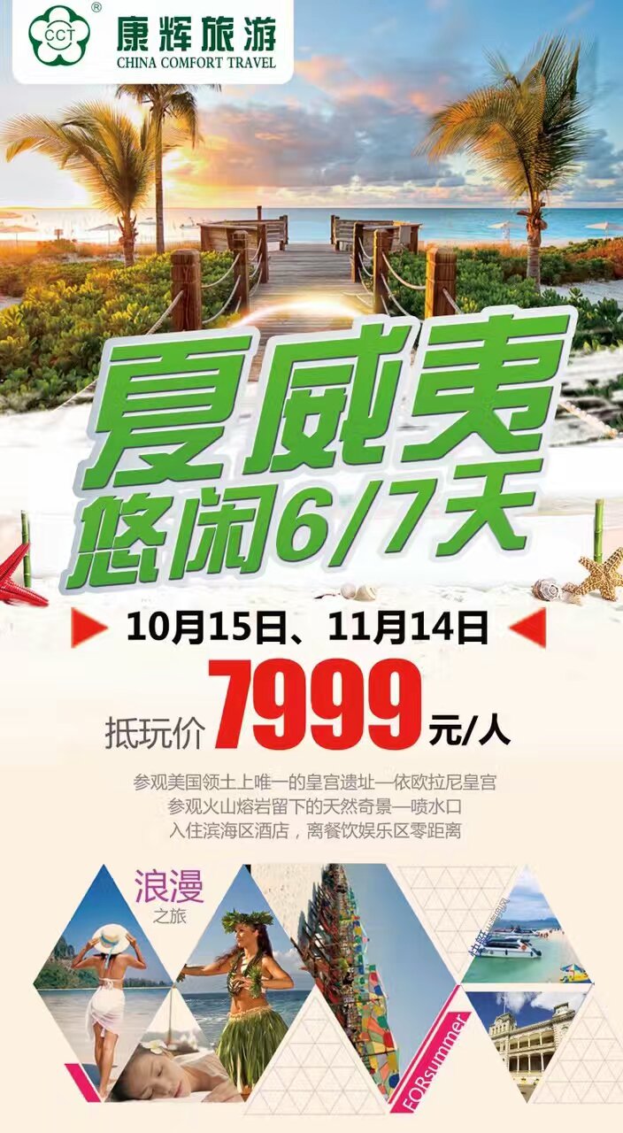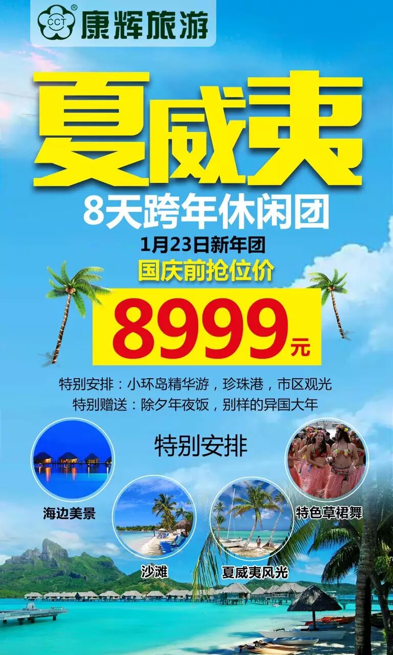夏威夷跨年團(tuán),康輝自主推薦2017年1月23日8天跨年休閑團(tuán)國慶搶位價(jià)8999元,特別安排除夕年夜飯